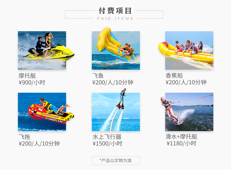 | 選配項(xiàng)目: | 摩托艇、飛魚(yú)、香蕉船、水上飛行器、飛拖、滑板、托傘 | ||||||